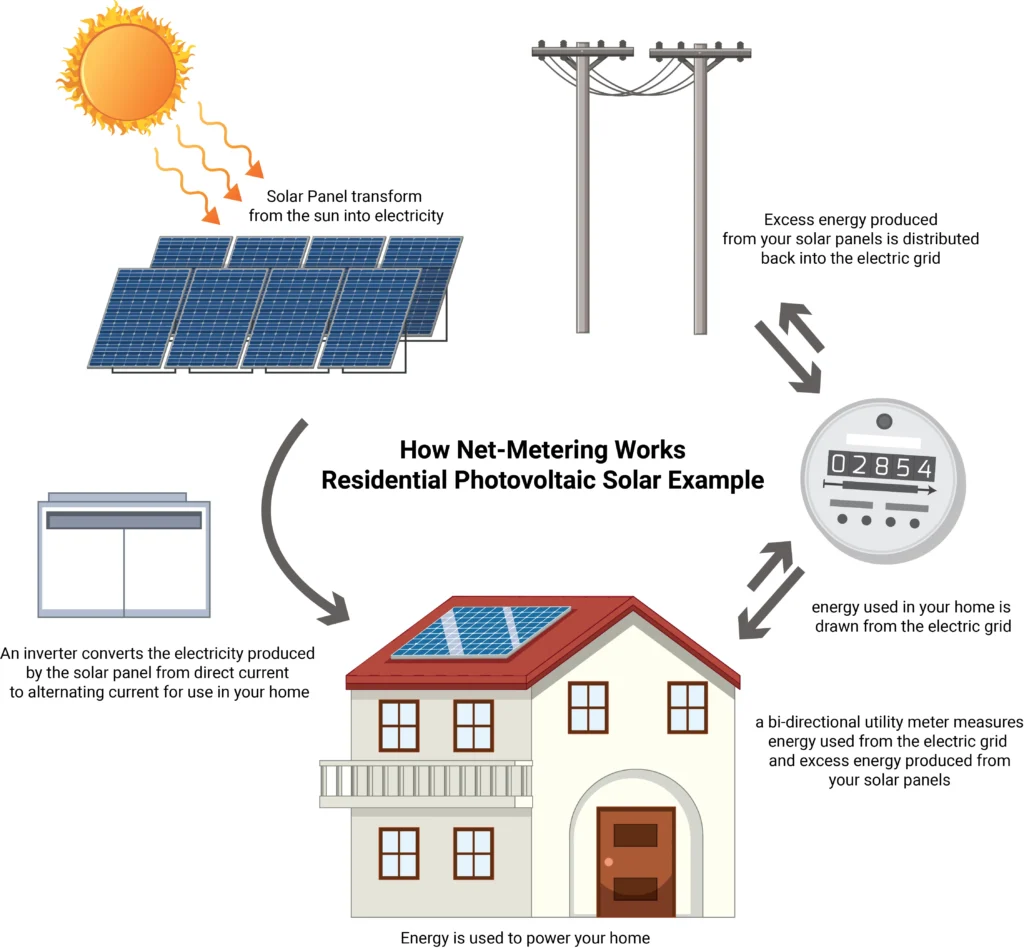 Net metering is a billing mechanism that allows solar energy system owners to receive credit for the excess electricity they generate and feed back into the grid. Essentially, it enables a two-way flow of electricity: when your solar panels produce more electricity than you need, the surplus is sent to the grid, and your utility company compensates you for it. Conversely, when your system is not producing enough electricity to meet your needs, such as during the night or on cloudy days, you can draw power from the grid, effectively using the credits you’ve accumulated.