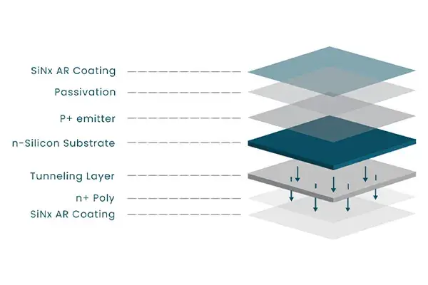 In the production of TOPCon cells, layers of tunnel oxide and polysilicon are applied to the rear side of the cell. This addition reinforces the cell’s capacity to manage elevated voltages, resulting in a substantial boost in power generation capabilities.