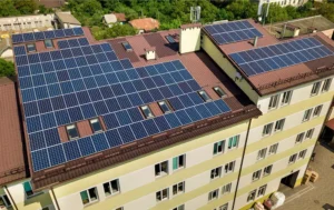 These are solar panels installed on the roof of a building. Rooftop solar systems are ideal for commercial and industrial buildings that have large, flat roofs. They can also be installed on residential buildings.